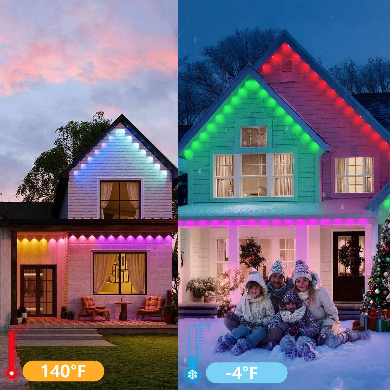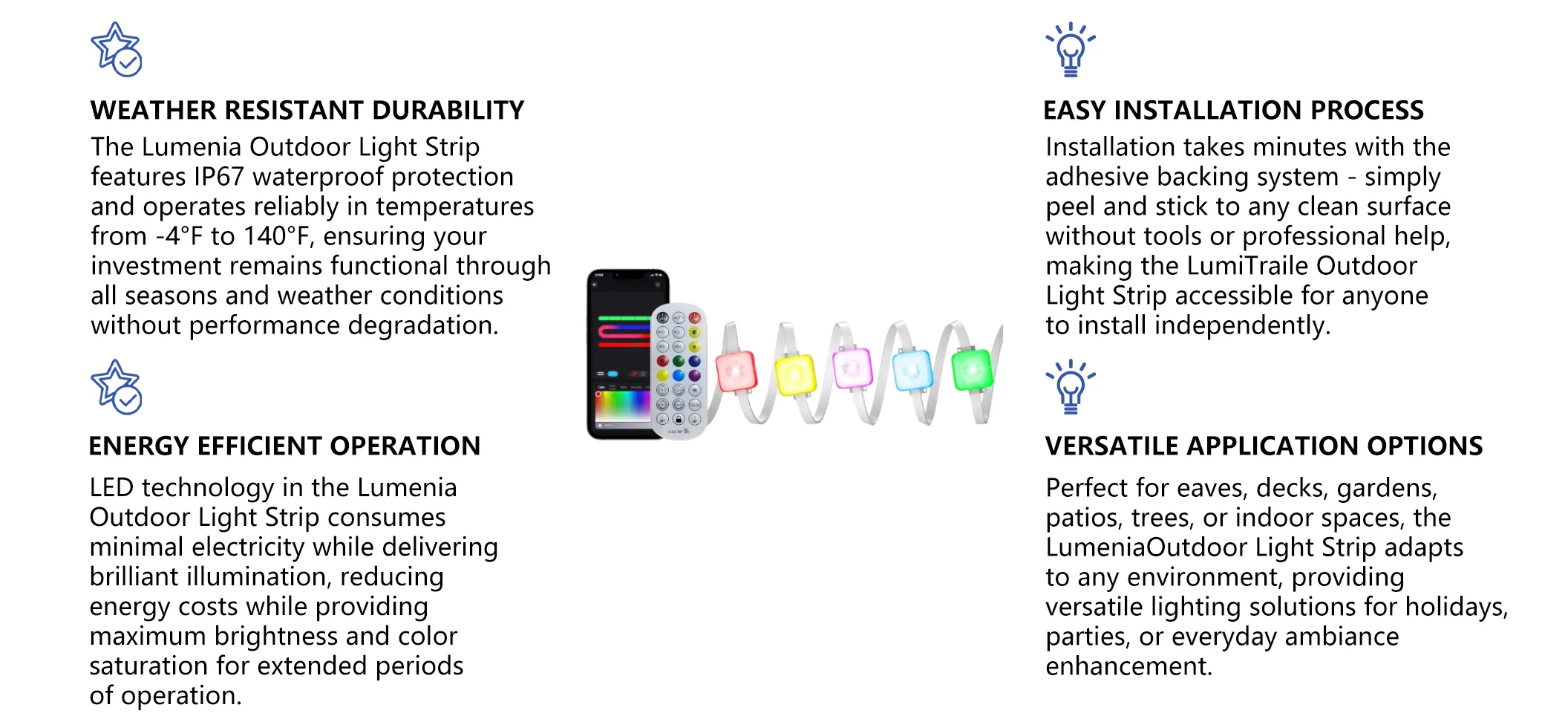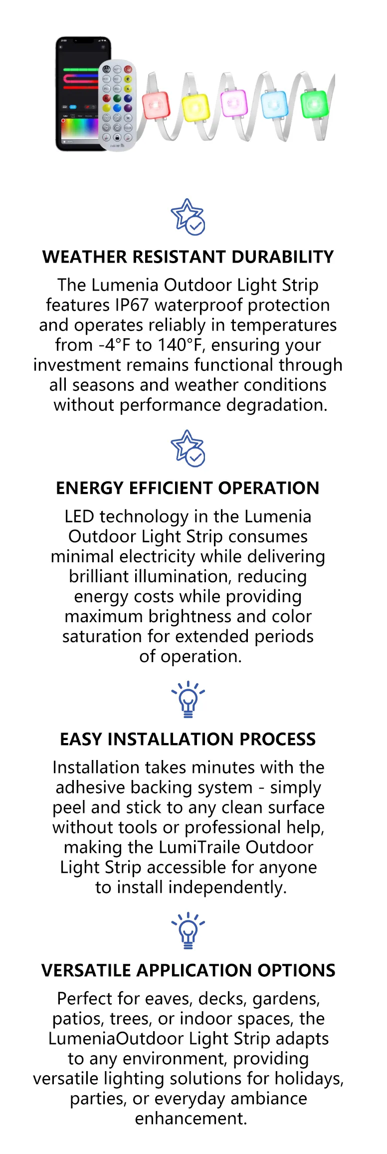 The Lumenia Outdoor Light Strip operates reliably in temperatures ranging from -4°F to 140°F, suitable for most outdoor climate conditions year-round.