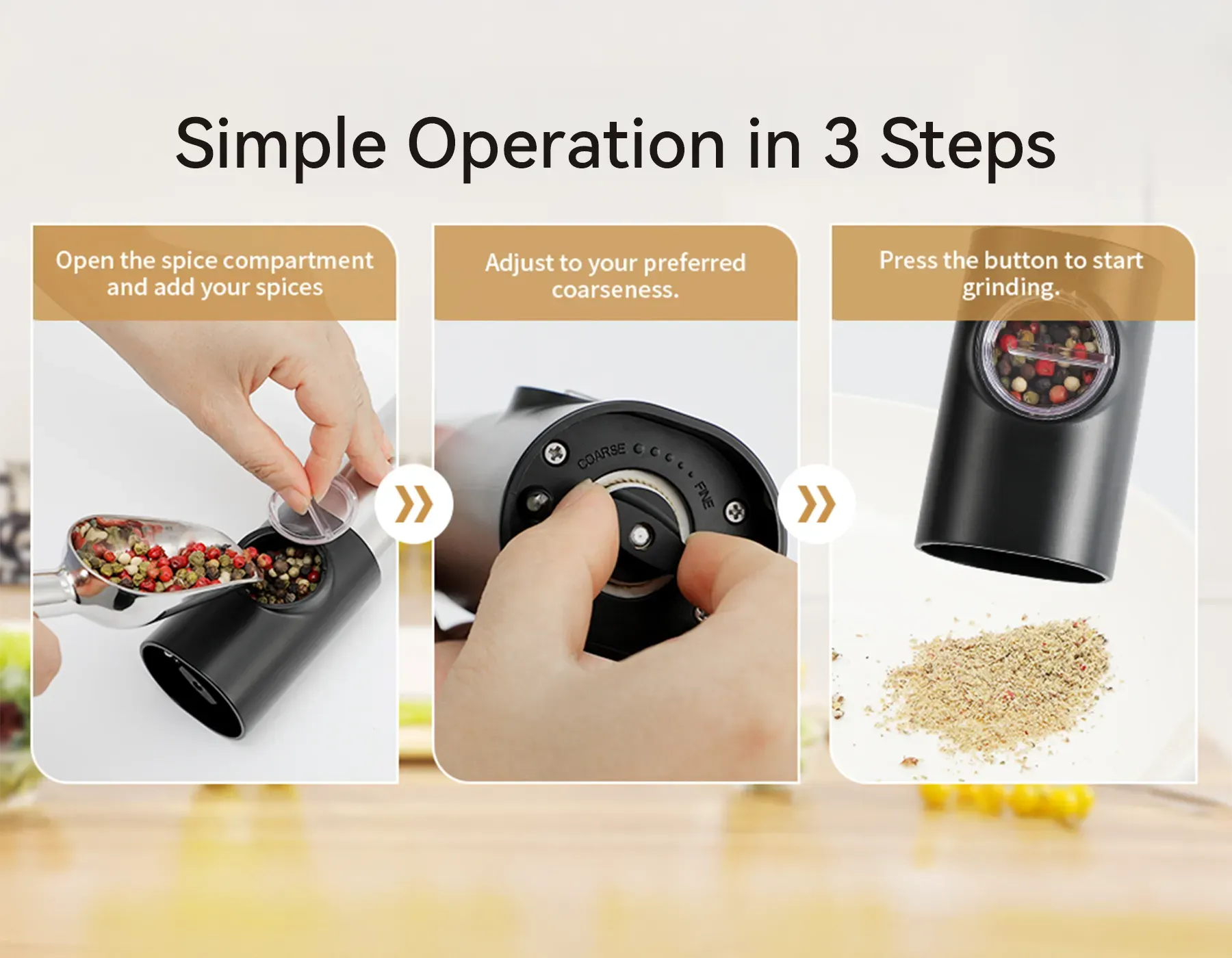 This electric pepper grinder delivers effortless one-handed operation and features an automatic LED light, so you can season with precision even in low-light settings. Perfect for late-night cooking, outdoor BBQs, or intimate dinners, it makes every meal easier and more flavorful.