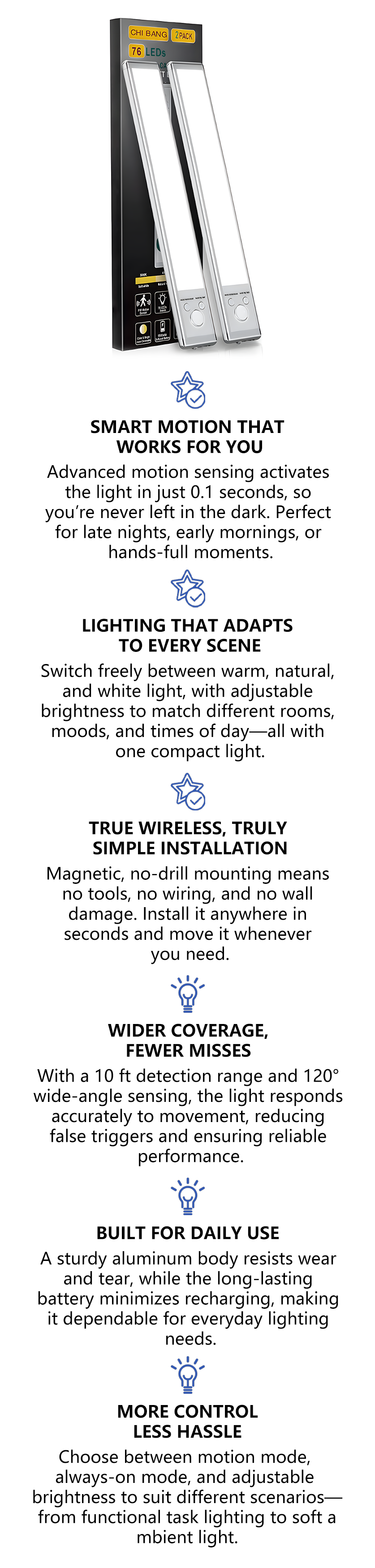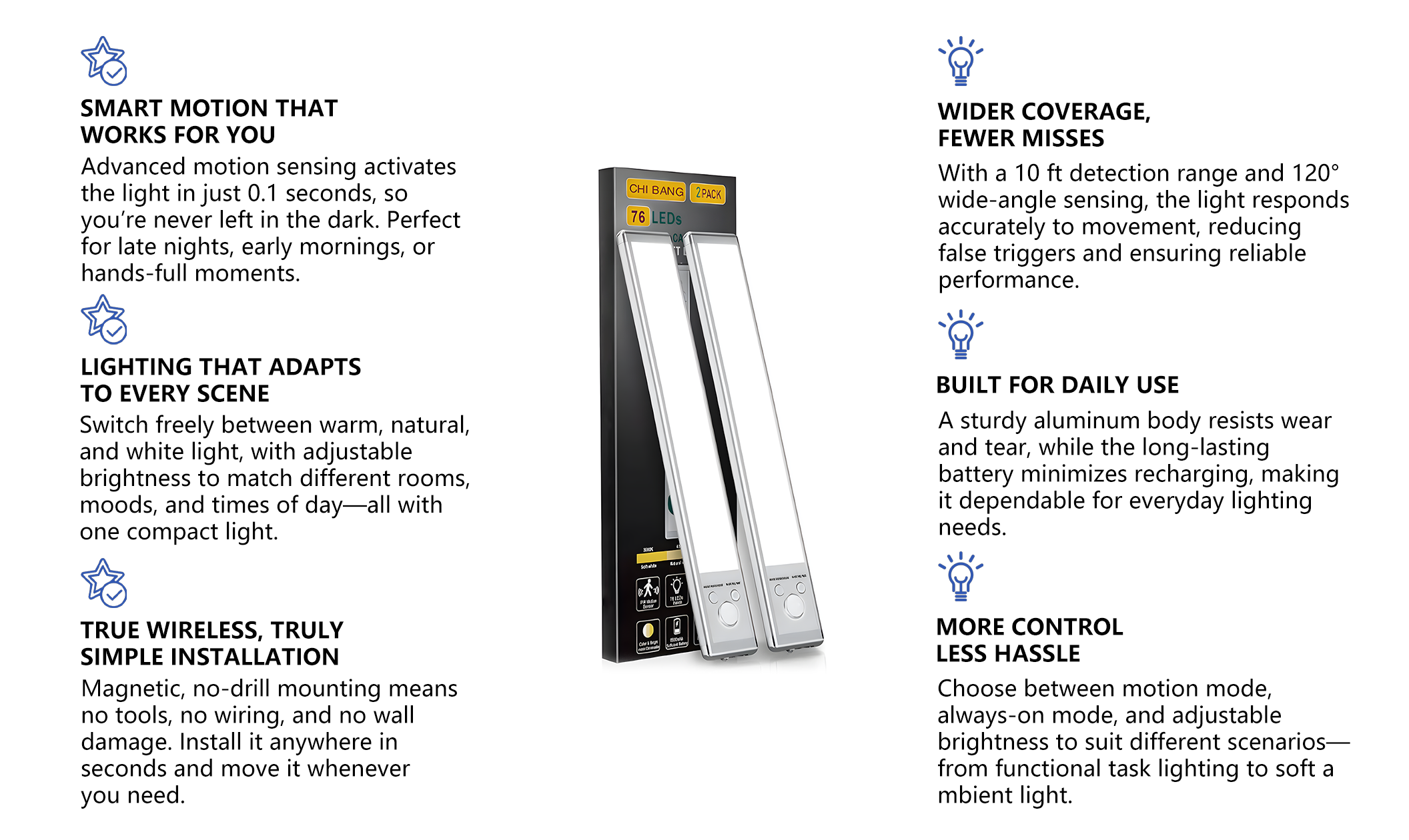 - Smart Motion Sensor, Lights On in 0.1s – Automatically turns on when you approach, making nighttime movement safer and hands-free.